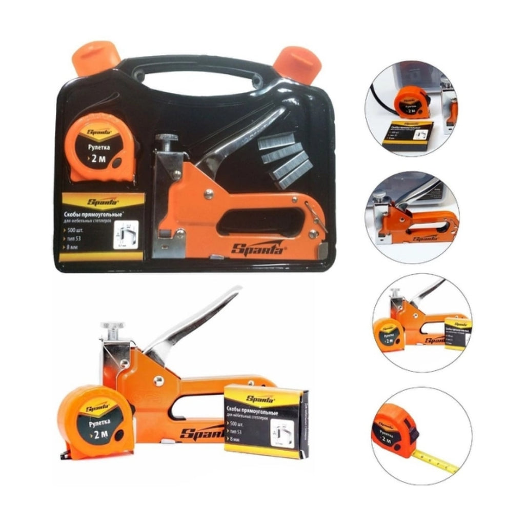 A principal distinção deste jogo e que contem uma trena. Trabalhando com grampeador de tapeceiro muitas vezes ha necessidade de medição, e este jogo universal permite armazenar todo necessário numa caixa. O jogo e embalado numa caixa de plástico com uma tampa transparente. O jogo contem grampeador de tapeceiro de metal, trena de medição (2m) e 500 grampos de tipo 53. Ajuste de pressão suave. Grampeador e usado para trabalhos de estofamento de moveis, construção de armários e outro. Com Trena 2M, 500 Grampos e Maleta. Sparta. Ideal para trabalhos de tapeçaria onde é necessário armazenar materiais pequenos. Indicado para trabalhos de estofamento de móveis, construção de armários e outro.