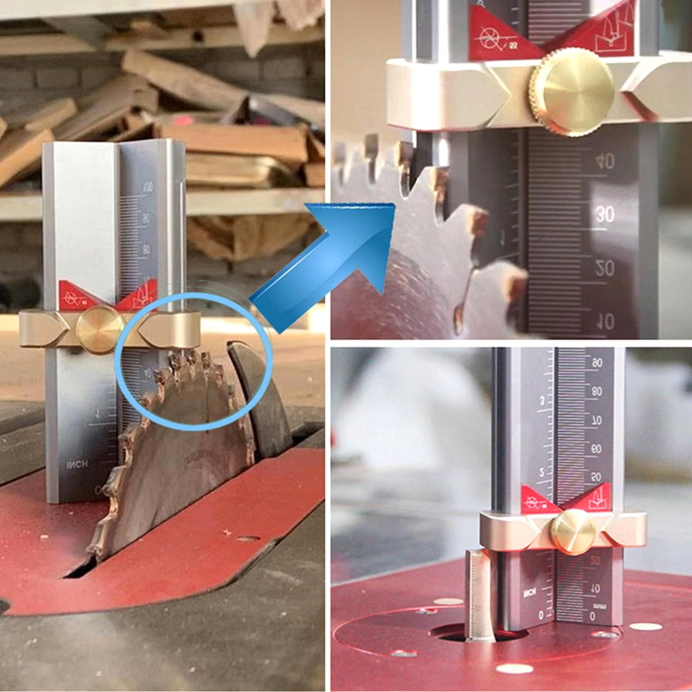 -A altura das lâminas das serras da tabela e a altura da ferramenta da aleta podem ser medidas.