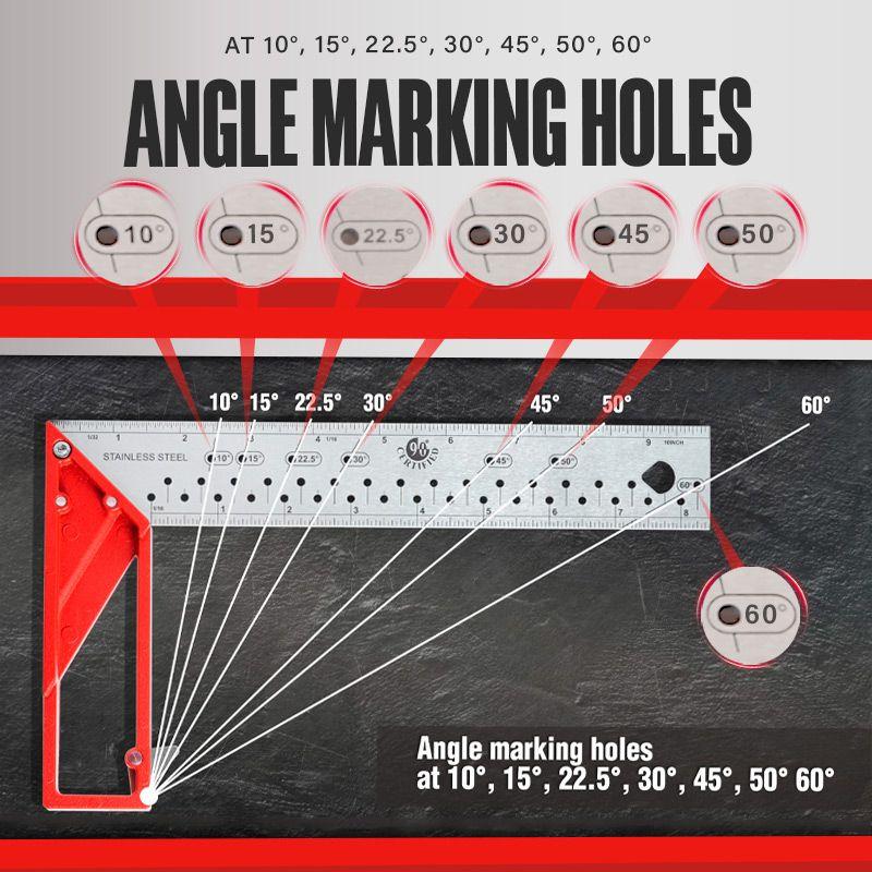 Ele tem Marcação de furos em 10 °, 15 °, 22.5 °, 30 °, 45 °, 50 °, 60 °Para marcação de ângulo e classificação de intervalo, e inclui aberturas em cada 1/4 Polegada Para a marcação paralela lisa da linha.